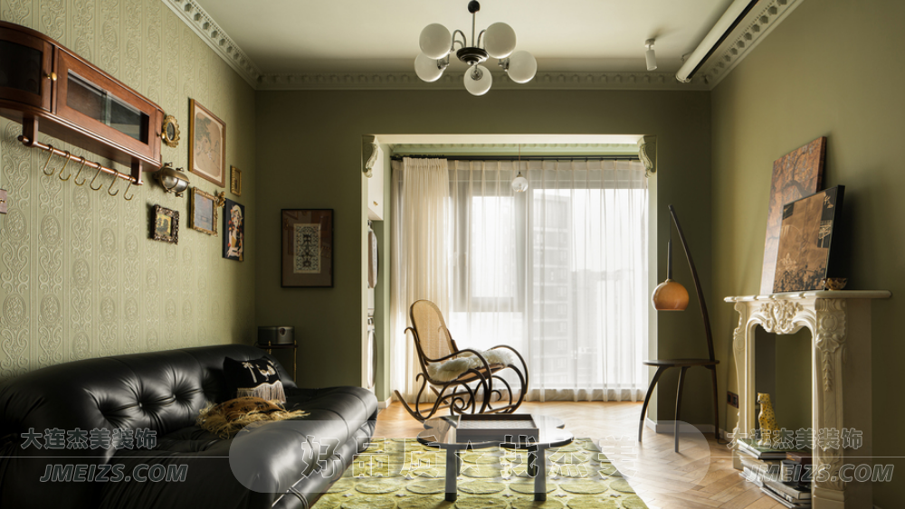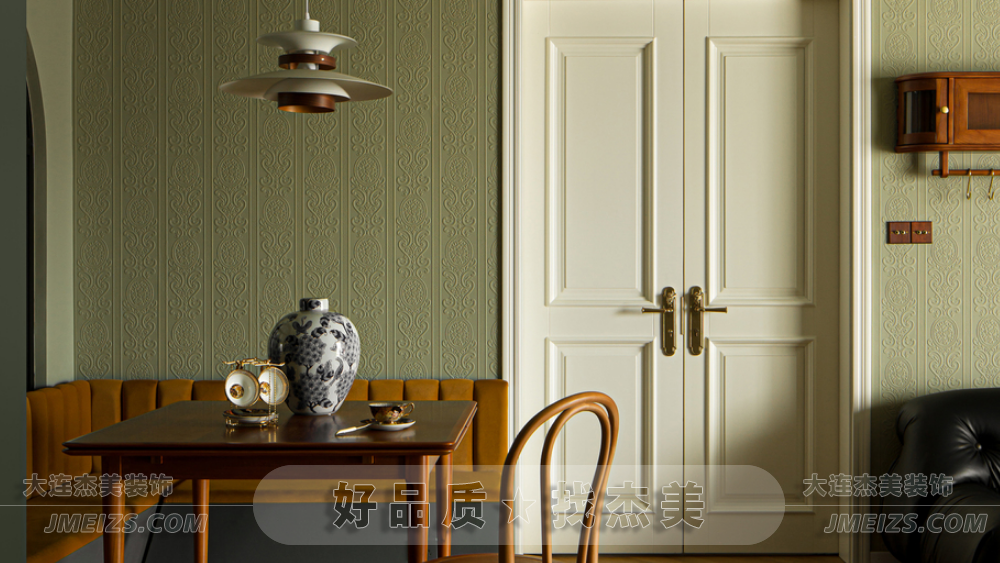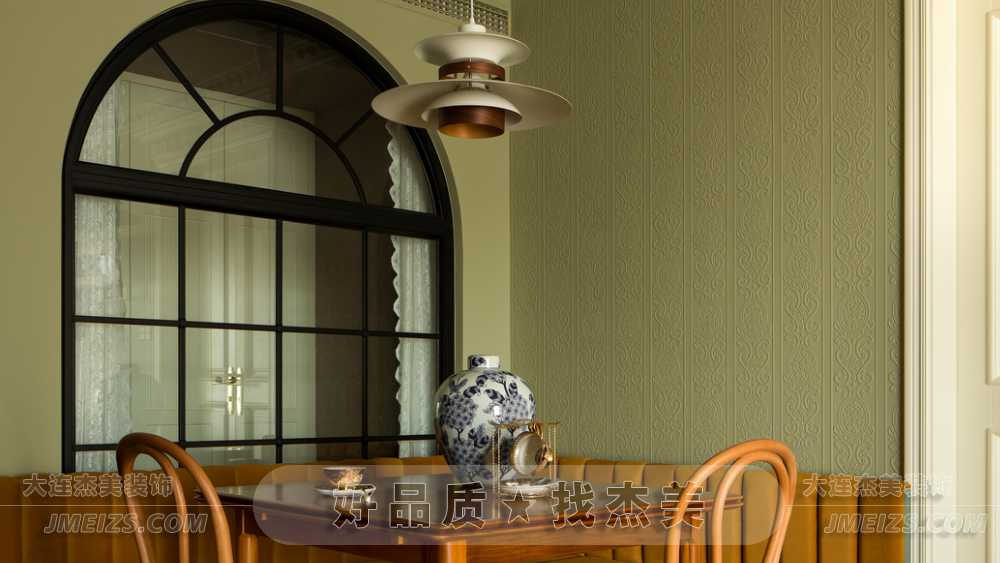本案在設計風格上,我們杰美裝飾設計師融合了王家衛電影的藝術美感和復古氛圍。線條雕塑、壁紙和海吉布被用來覆蓋原始墻面,保留了墻體的本真,卻減少了痕跡的顯露。