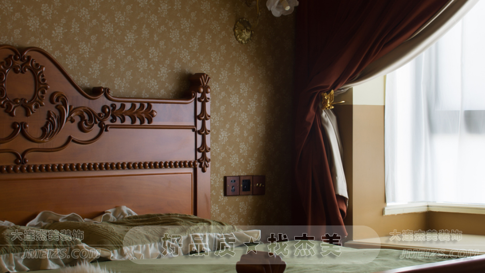 臥室床頭采用簡單的石膏角線和一些壁紙來豐富女主的喜好和個性,實木復古床頭與常規窗簾掛法不同,展現女主細膩的性格和高雅的審美。