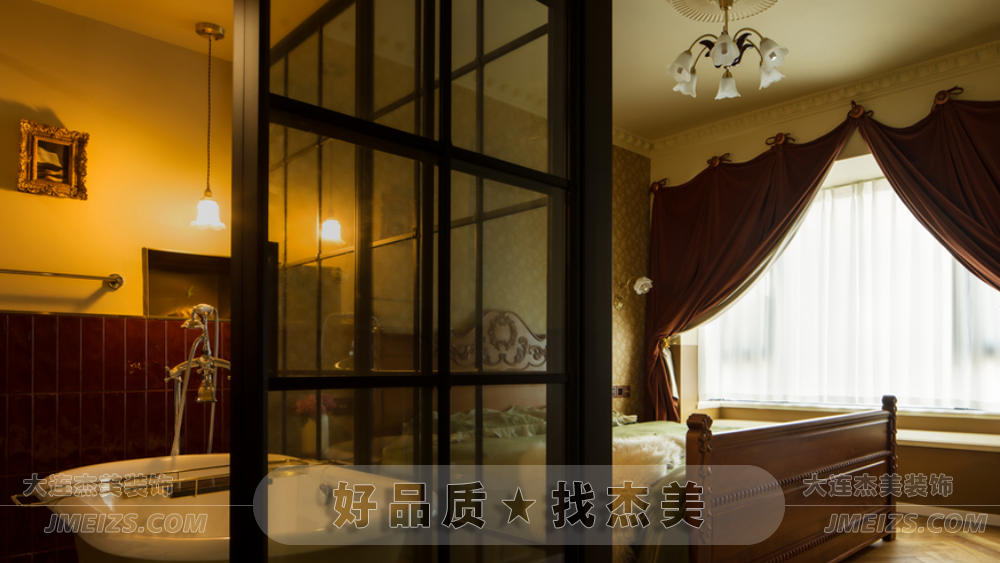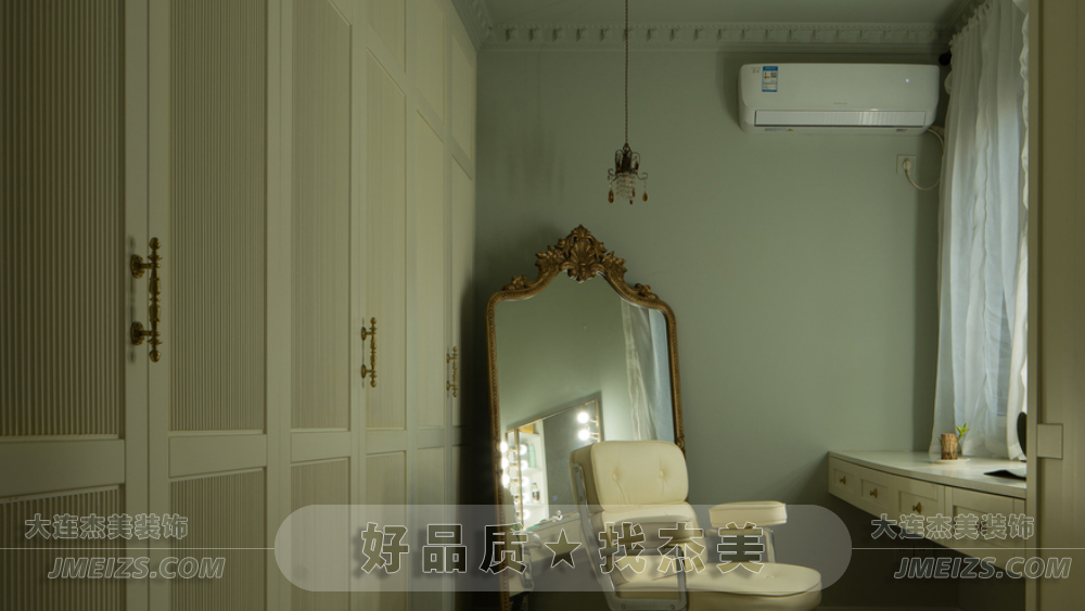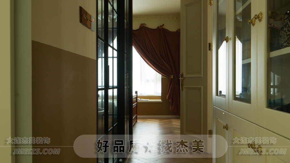 臥室的房門是整個空間的精神所在,我們杰美裝飾定制了一對超高的對開門,并在頂部利用石膏線裝飾門楣,使對開門顯得更高一些,更具形式感。