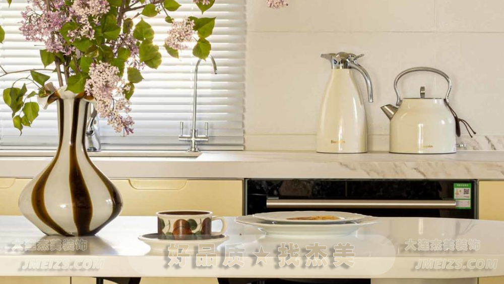 餐廳和廚房連成一體,沒有隔墻,沒有門,只有一張圓桌和四把餐椅,讓我們和廚房保持互通。杰美裝飾設計師在這里用靠墻增設島臺的方式來擴大餐廚空間的使用率和儲物功能。島臺上有一個蒸烤箱和一個洗碗機,都是嵌入式設計,釋放了廚房操作空間。島臺下有一個展示柜區,主要用來置放女屋主的包包,下方還有一組屜柜,收納飾品或其他小物。