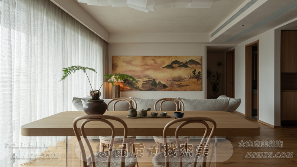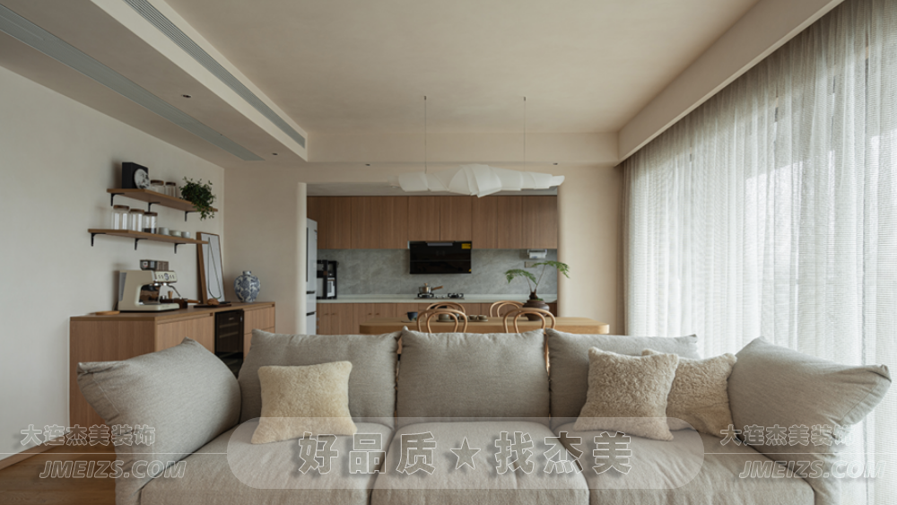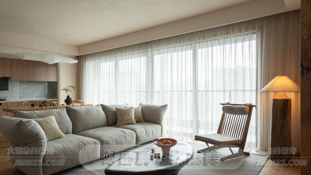 客廳的設計靈感來源于日式的禪意和自然。一體化的開放式客餐廳,雖然與傳統日式有所不同,但卻更加空靈和寧靜。